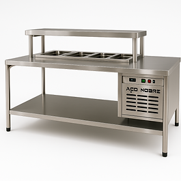 Ideal para lanches, saladas e pratos frios. Com cubas refrigeradas e tampo aquecido, otimiza a produção e oferece espaço para toaster e conservador de proteína.